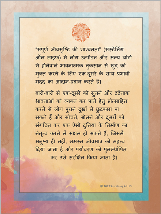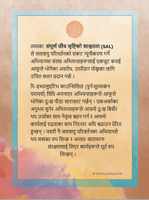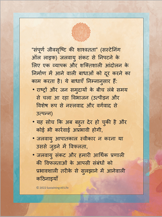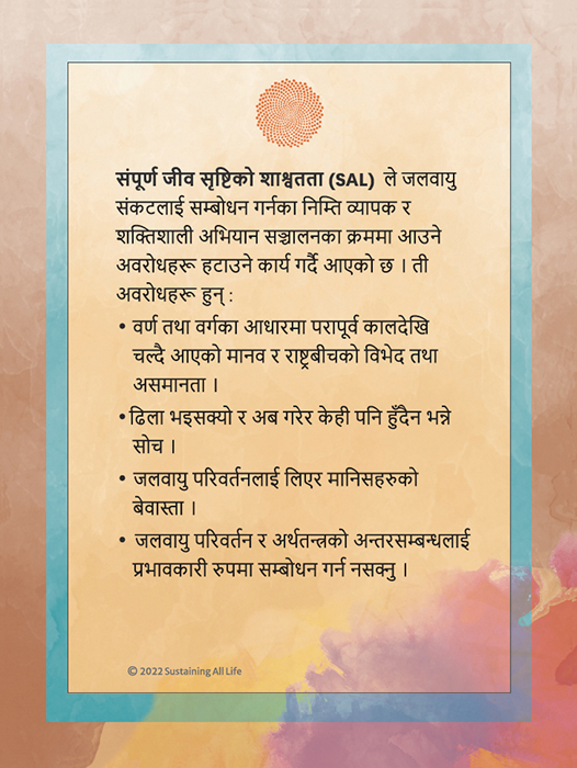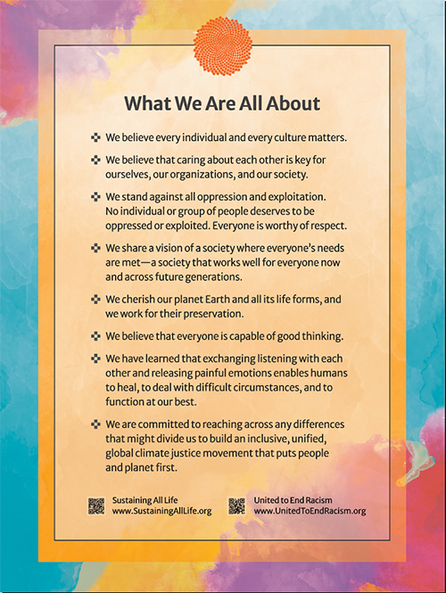 These images show the posters used by Sustaining All Life in our booths in the Blue and the Green Zones at COP27. We are making these posters available for you to use, in exchange for a donation (if you can). You can have the posters printed locally and you may also use them digitally. Each poster was created in English and translated into one of the other official languages of the United Nations — Arabic, Chinese, French, Russian, and Spanish.